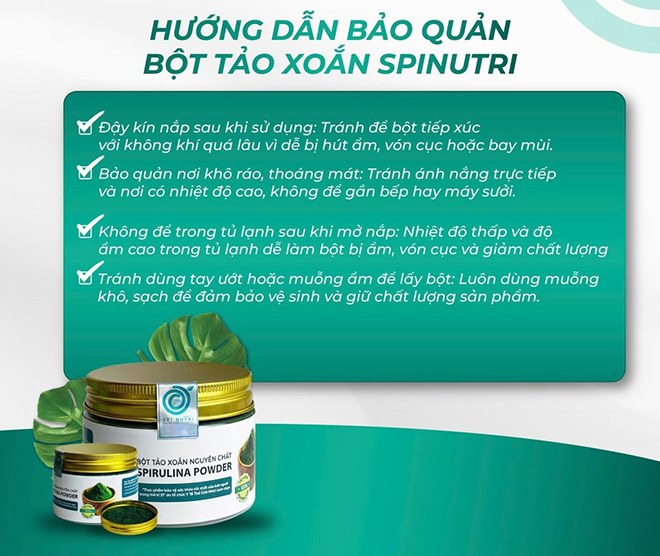 - 100% tảo xoắn Spirulina nguyên chất, không chất bảo quản, không chất phụ gia