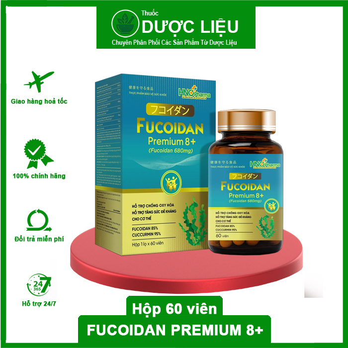 Thực phẩm bảo vệ sức khỏe Fucoidan Premium 8+ được bào chế từ tảo nâu Mozuku nhập khẩu từ nhật bản kết hợp với 7 loại thảo dược quý, có tác dụng tốt đối với các bệnh nhân đang trong quá trình điều trị các khối u và ung thư, đặc biệt là với các bệnh nhân đang hóa trị hay chiếu tia. Khi sử dụng viên nang Fucoidan Premium 8+ đúng giờ sẽ giúp phát huy tối đa tác dụng hỗ trợ giảm thiểu sinh ra khối u do tác nhân oxy hóa đồng thời giúp bảo vệ các tế bào lành, bảo vệ hệ miễn dịch, giúp bệnh nhân ăn ngủ tốt hơn, giảm mệt mỏi, phục hồi và nâng cao sức khỏe người bệnh, làm tăng hiệu quả điều trị của các phương pháp điều trị Tây y.